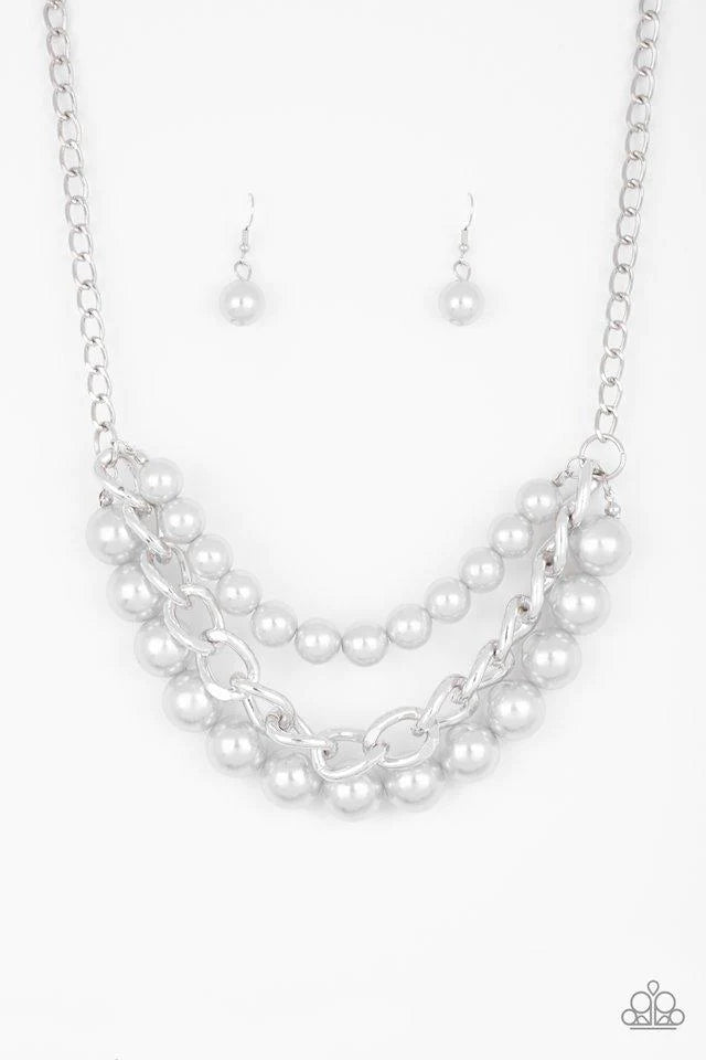 Two strands of dramatic silver pearls flank one strand of oversized silver chain, creating statement-making layers below the collar. Features an adjustable clasp closure.