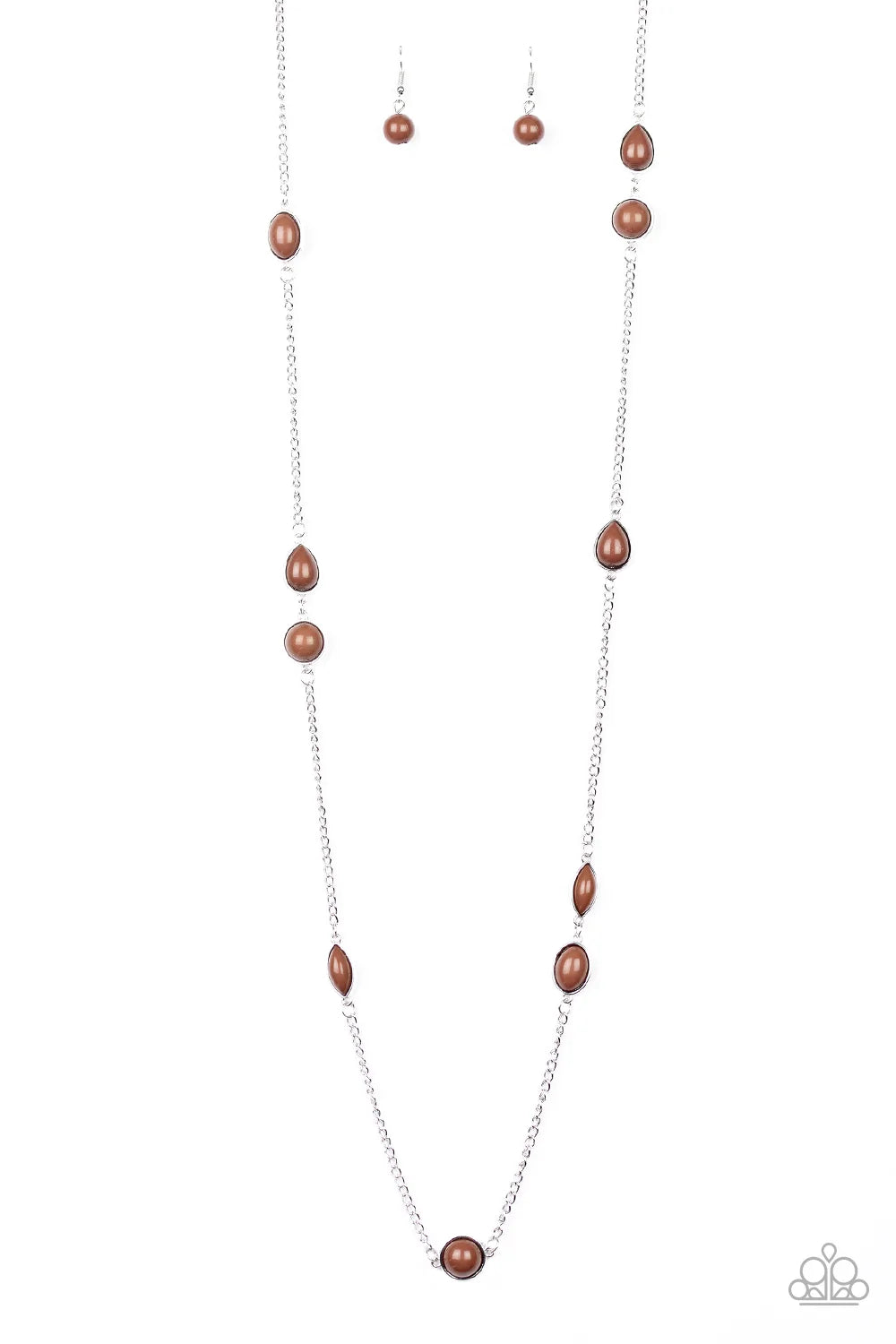 Featuring round and teardrop shapes, brown beading trickles along an elongated silver chain for a seasonal look. Features an adjustable clasp closure.